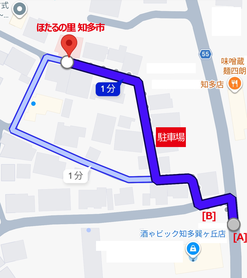 半田街道沿いの「酒 ビック」の赤い看板の所[A]が入り口です。
